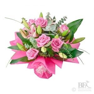 The ever popular fragrant hand-tied bouquet of 6 roses & lilies, complete with wrapping and exotic foliage. Please choose your rose colour at the checkout.